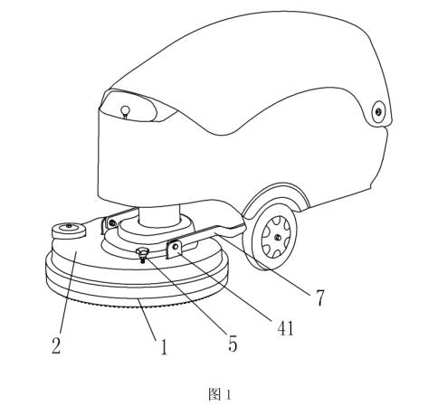 洗地機(jī)刷盤牽引結(jié)構(gòu),包括刷盤電機(jī)及與刷盤電機(jī)底座固定連接的刷盤組件,刷盤電機(jī)及刷盤組件上套裝有刷盤罩,其特征在于:刷盤組件與刷盤罩之間設(shè)置有支架,所述支架穿過(guò)刷盤罩與洗地機(jī)提升桿鉸接連接;所述支架上還鉸接安裝有電機(jī)固定板,所述電機(jī)底座與電機(jī)固定板固定連接并固定在刷盤組件中心軸上,調(diào)節(jié)螺栓穿過(guò)支架及刷盤罩并頂緊在電機(jī)固定板的端面上。